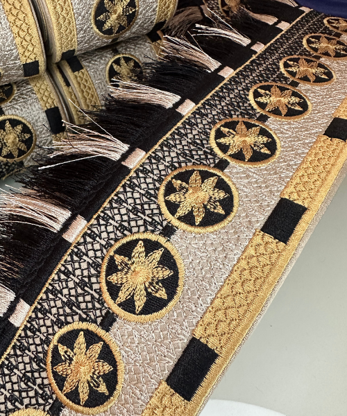 Altın detaylı, püsküllü bordür şeridi; perde, masa örtüsü ve dekoratif tekstil uygulamalarına zarafet katar. Etnik desenleri ve kaliteli dokusuyla göz alıcı bir tamamlayıcıdır.